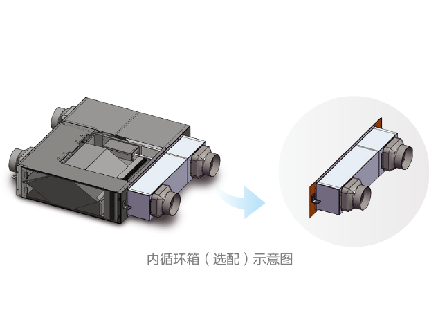 可選配內(nèi)循環(huán)箱,實現(xiàn)內(nèi)循環(huán)功能,可一鍵轉(zhuǎn)換為空氣凈化器,循環(huán)凈化室內(nèi)空氣,持續(xù)改善室內(nèi)空氣品質(zhì)。 當(dāng)室外空氣質(zhì)量極差、污染嚴(yán)重時,不建議室內(nèi)引入新風(fēng),開啟旁通交換模式,關(guān)閉排風(fēng)口進(jìn)行內(nèi)循環(huán),室內(nèi)空氣流經(jīng)三重過濾網(wǎng),高效凈化,改善空氣質(zhì)量。
