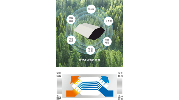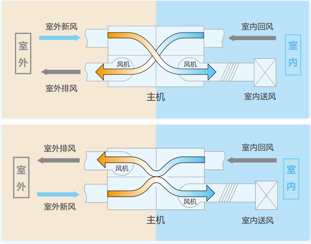 夏季運行時,新風(fēng)從空調(diào)回風(fēng)中獲得冷能,使溫度降低;同時被空調(diào)回風(fēng)干操,使新風(fēng)含濕量降低;在冬季運行時,新風(fēng)從空調(diào)回風(fēng)中獲得熱能,使溫度升高,同時被回風(fēng)加濕,使新風(fēng)含濕量增加,使送入室內(nèi)的新風(fēng)溫度濕度更加舒適。