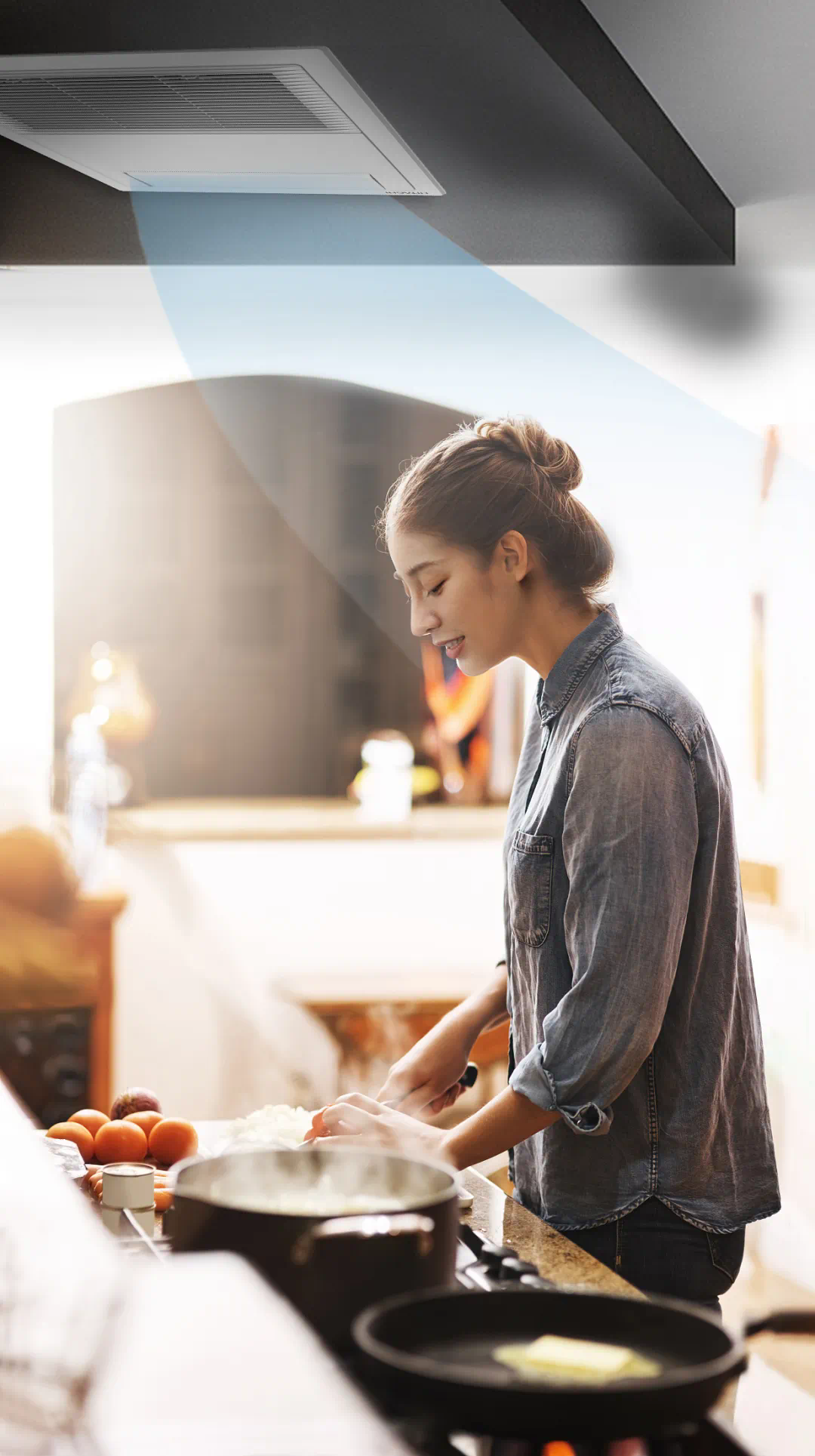 烹飪時會產(chǎn)生大量熱蒸汽、熱輻射,廚房溫度高,日立廚房空調(diào)強勁送風(fēng),舒適氣流自上而下均勻覆蓋,不會對煤灶的明火暗火產(chǎn)生影響。還可選配低溫除濕模塊,10℃低溫除濕,時時保證廚房的干爽環(huán)境,保護(hù)食材及廚具不受潮濕影響。